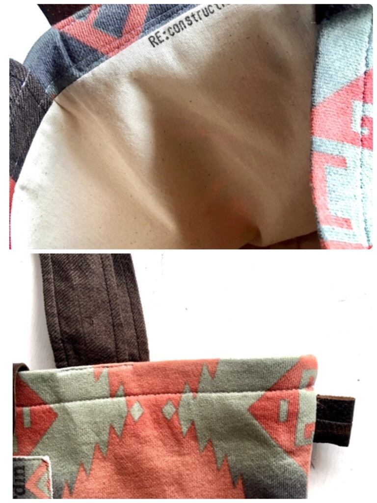 サイケデリックな柄が目を惹くプリントのスウエット地はいい具合にアタリも出来てナチュラルな肌触りに発色の良いヨーロッパメイドのケミカルウォッシュのデニムのコンビ。ミリタリーバッグの皮革フラップも良い雰囲気のトート。お色はサーモンピンク系。