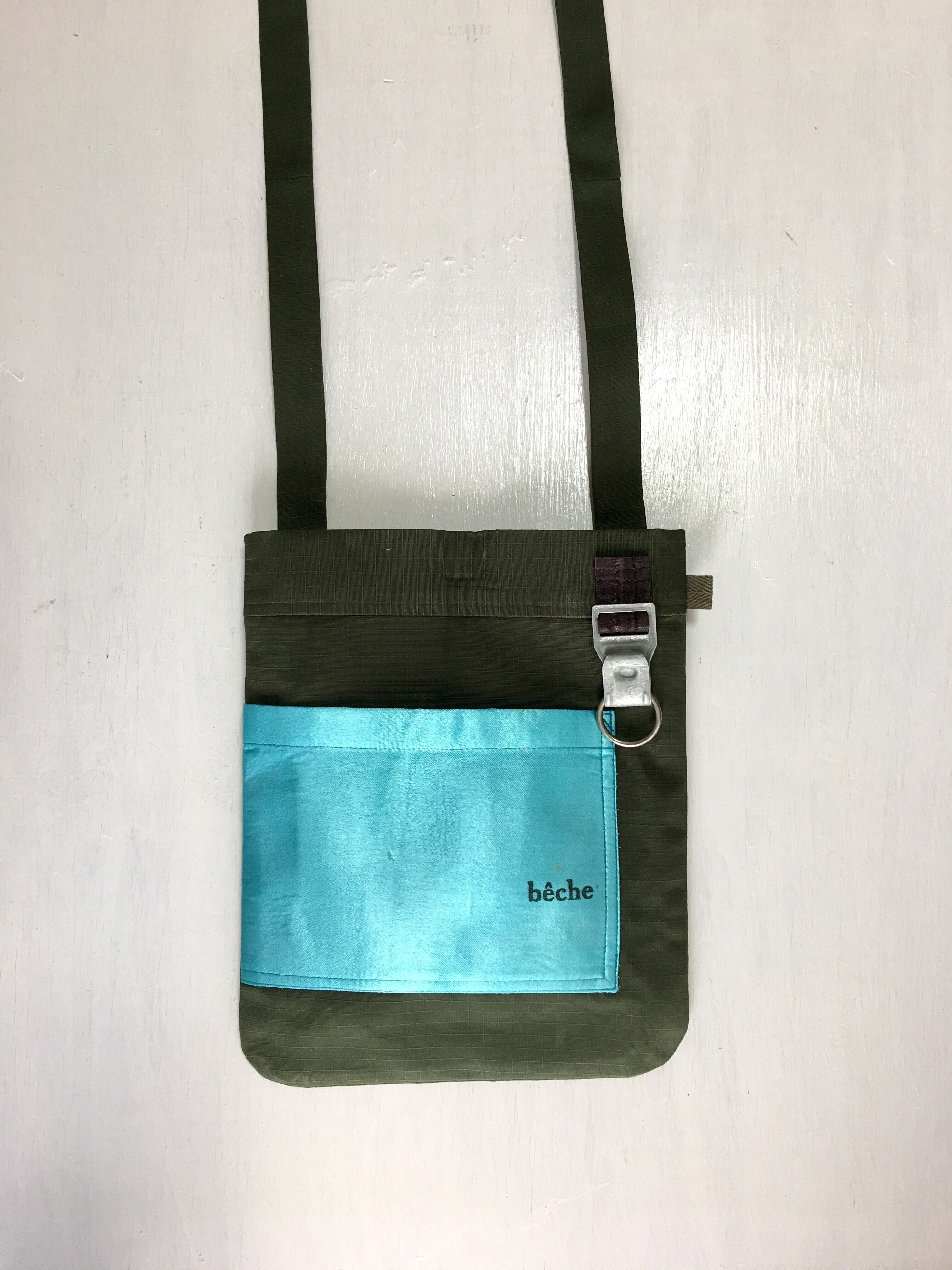ヴィンテージのリップストップをベースに鮮やかなサテン地のポケットが目を惹くサコッシュです。