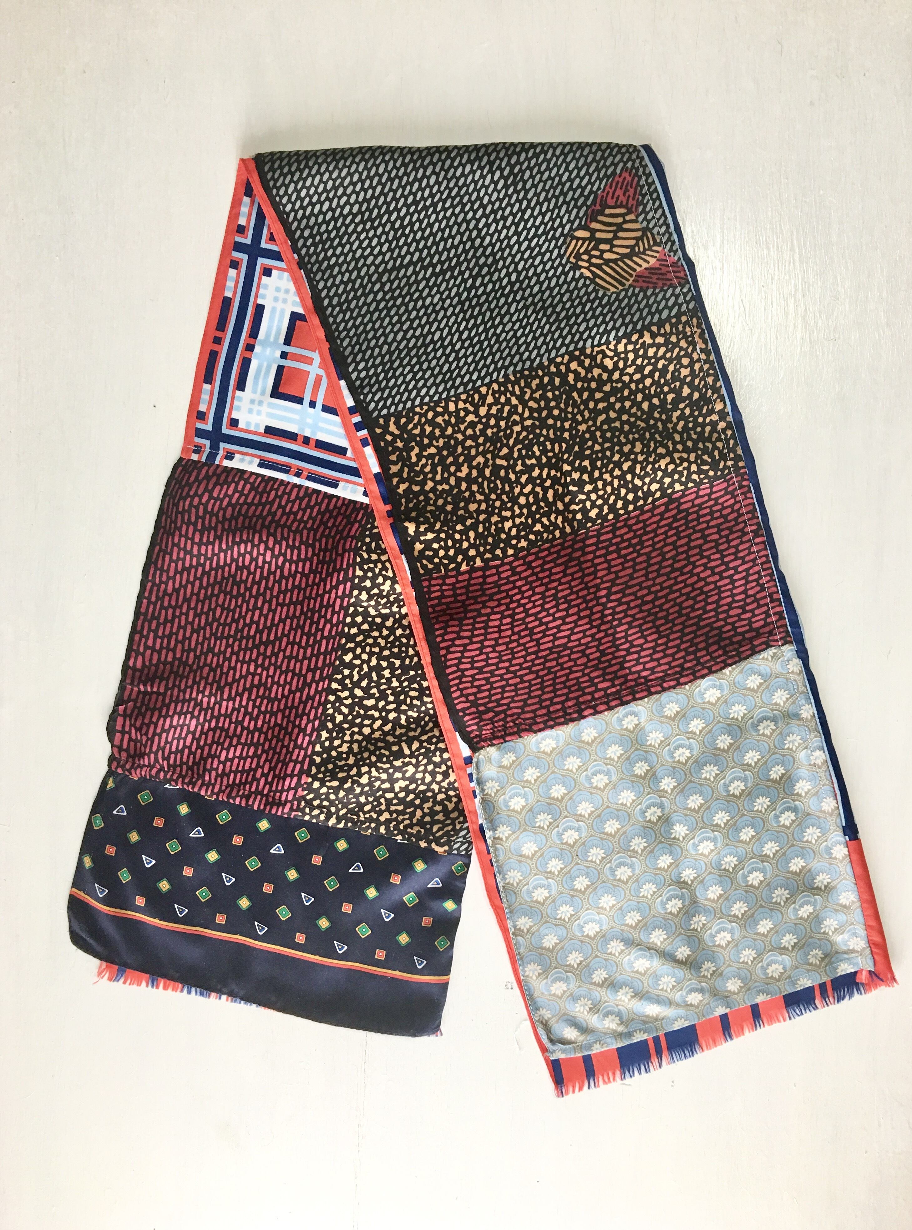 ヨーロッパメイドのヴィンテージのシルクやポリエステル等のスカーフをランダムに解体し数種を接ぎ合わせファブリック状にしたスカーフです。
